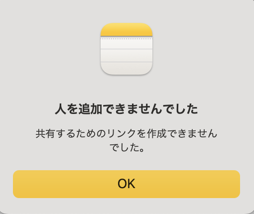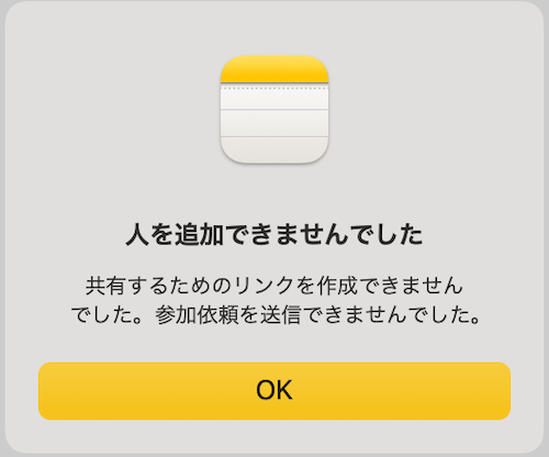 Macのメモ.appにてiCloudにメモを作成し,「このメモを共有」ボタンを押して「共同作業」を選択のままで,相手を選択しましたが,「人を追加できませんでした」「共有するためのリンクを作成できませんでした。参加依頼を送信できませんでした。」というメッセージが出現して,共同作業できません.