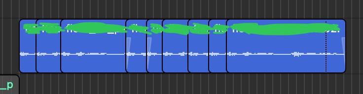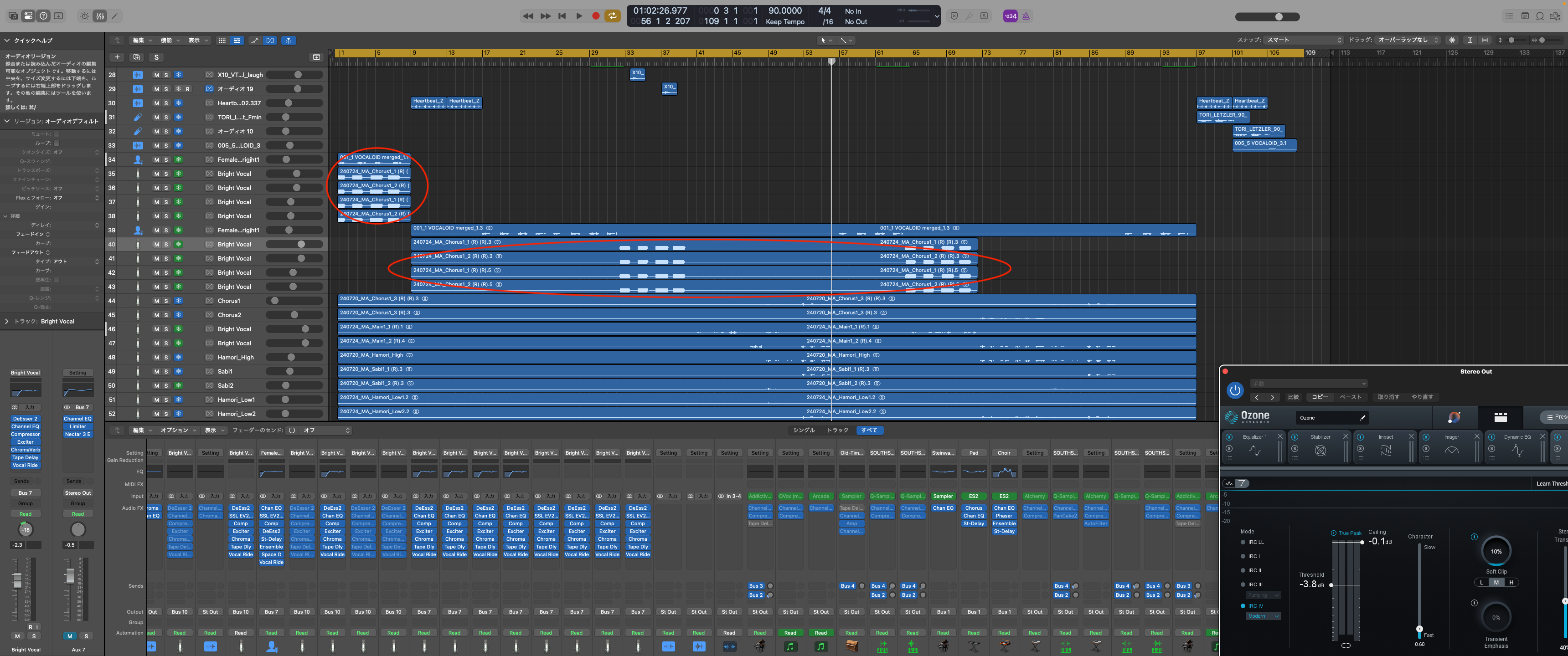 6個のオーディオリージョンとなっていましたがなぜか実際には9個がおかしくなっており、全てコーラスパートでピッチ修正、タイミング修正などかなりの時間をかけて編集したのに全部おかしくなってました。