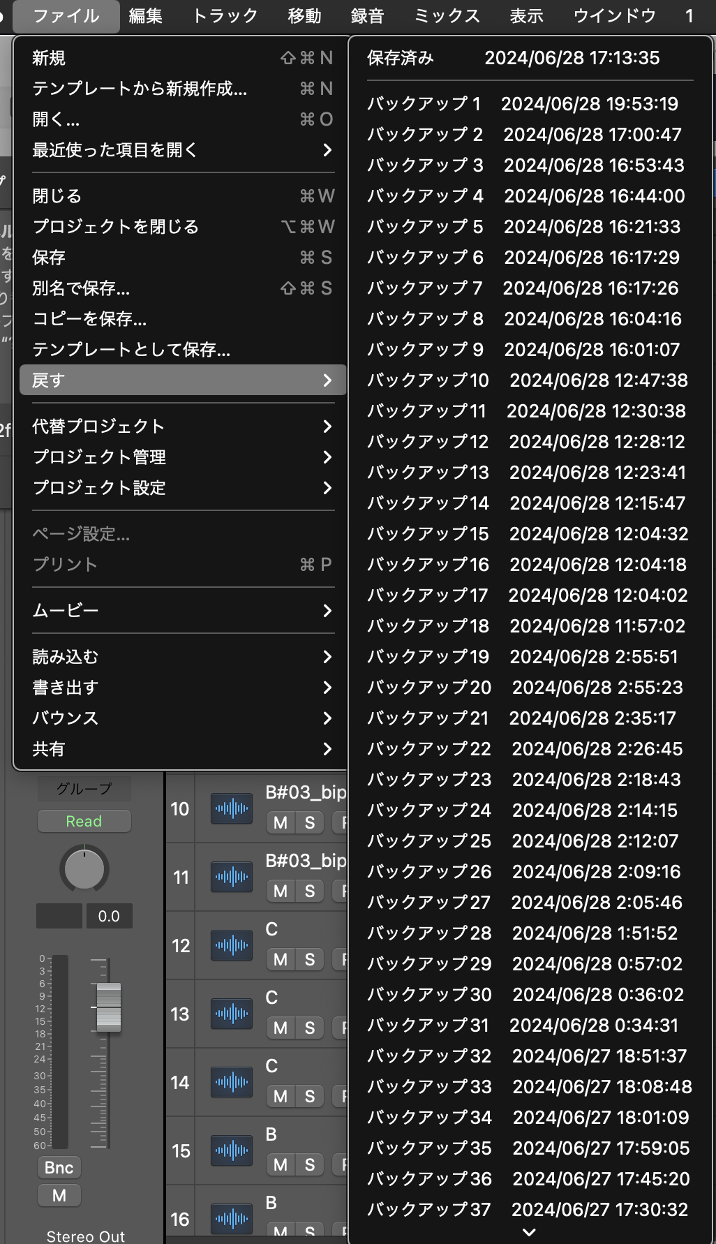 Logicのファイル>戻す からバックアップで戻してもダメでTime Machineからやってもダメでした。