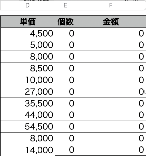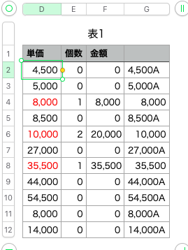 下の図で列Eの個数が正になった時、列Dの単価がレッドテキストになるように設定したい