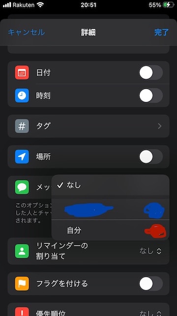 共有相手の名前と写真(青で塗り潰しているところ)は、出てくるのですが、自分の写真(赤で塗りつぶしているところ)は出てこず、私の顔写真の代わりに名字が表示されています。設定のiCloudには顔写真は設定しているのですが、なぜかリマインダーの割り当ての顔写真には反映されません。原因は何でしょうか。ご教示ください。