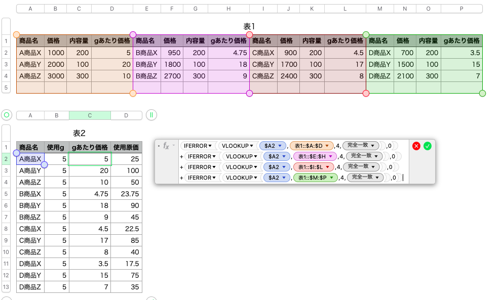 numbersで原価計算ができるようにしたいのですが、シート1に商品名、価格、内容量、1g当たり価格(関数)を入力しデータをつくり、シート2以降で各商品のレシピシートを作りたいと思っています。