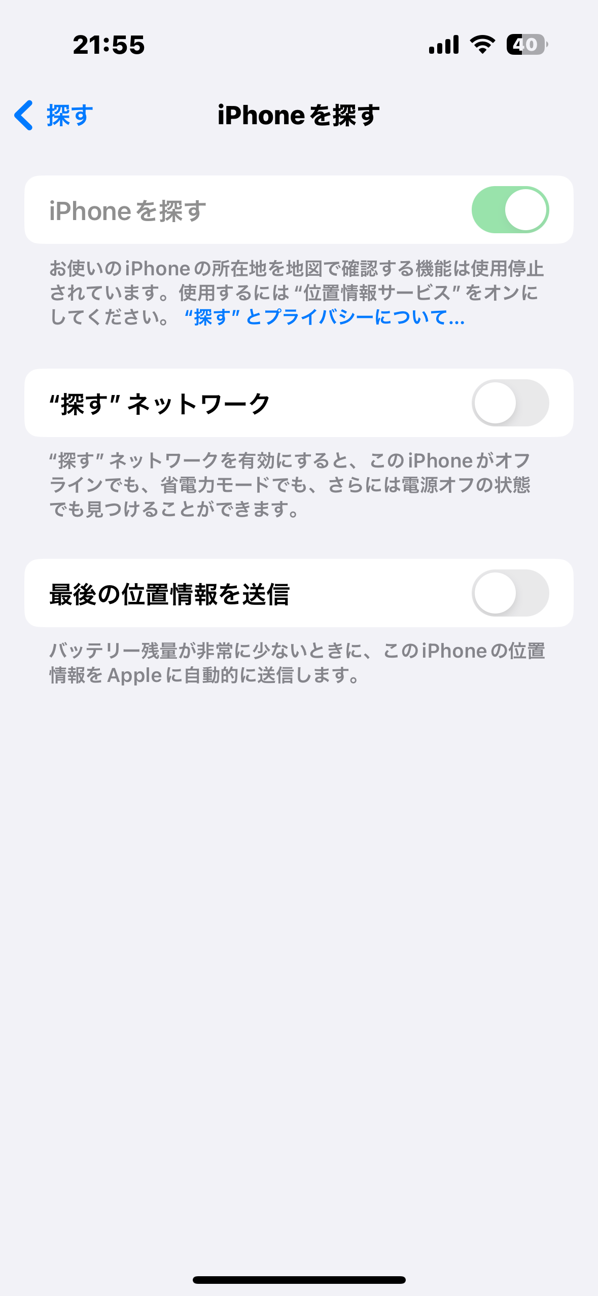 iPhone を探すが、薄緑になっててオフにできない