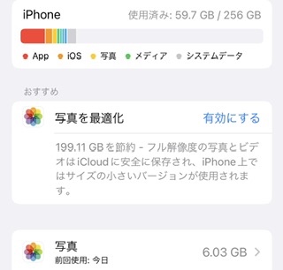 256GBのデバイスで240GB使用で写真の最適化のメッセージが何度も出てきていましたがせず。