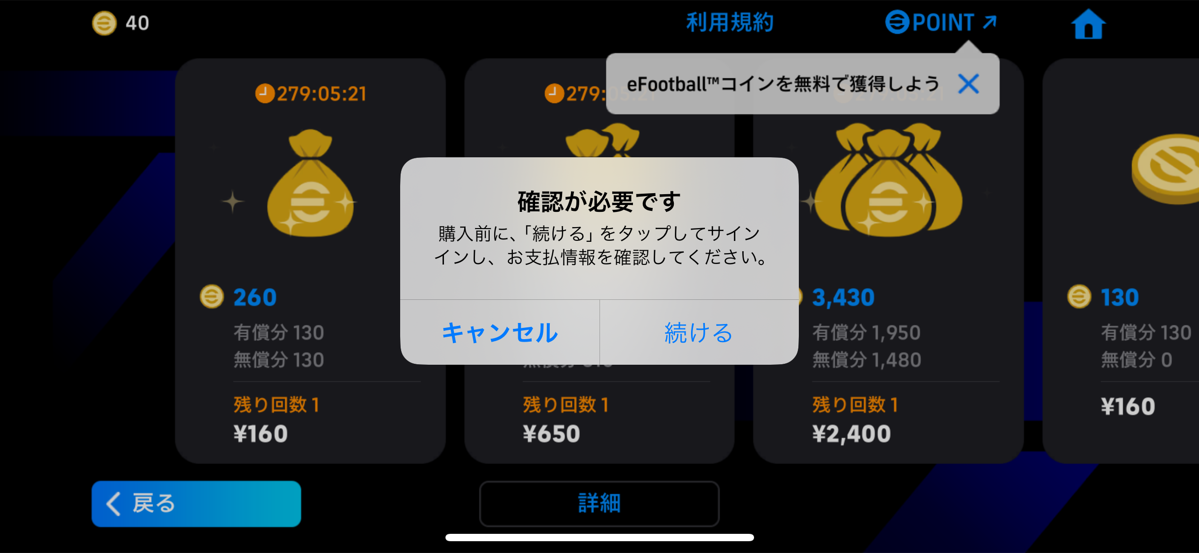 状況が良く分からないのですが、「eFootball™ 2024」のアプリ内でアイテム(コイン)等を購入しようとすると、添付して下さった画面が表示されると言う事でしょうか?
