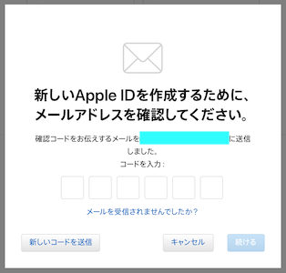 このメールアドレスを新しいApple IDとして選択しました。このメールアドレスがあなたのものであることを確認するには、メール確認ページで以下のコードを入力してください。