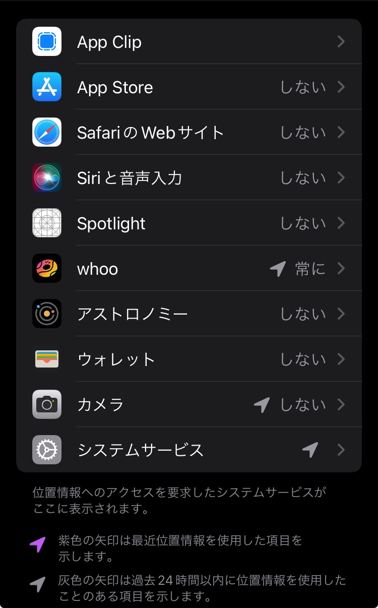 今のところ画像の通りで位置情報サービスはオンにしてます