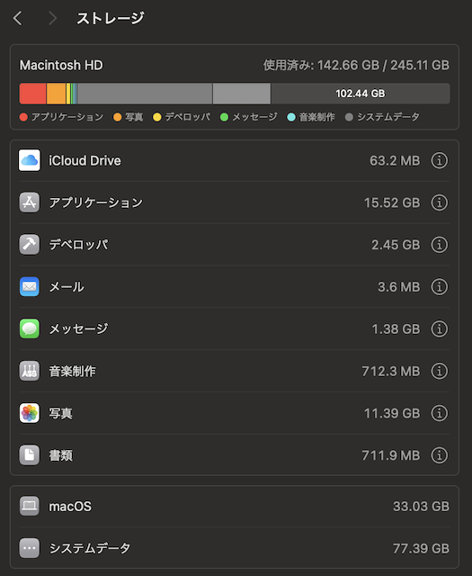 設定からストレージを見てみると、システムデータが77.39GBとかなりの容量を占めています。