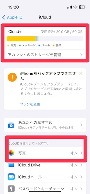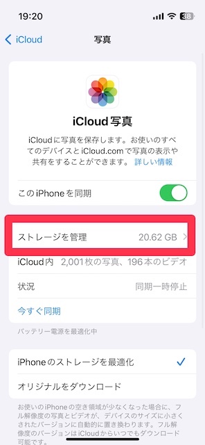 [iCloudを使用しているアプリ]の写真は20Gとっているのですが、