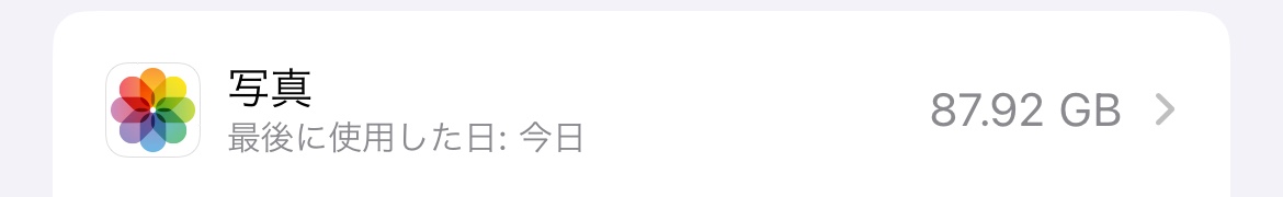 現在の写真、ビデオは合わせて2698項目ですが、「写真」のストレージが87.92GB占めています。私の友達は2万項目以上あって、それでも70GBほどでした。「最近削除した項目」も全て削除しています。