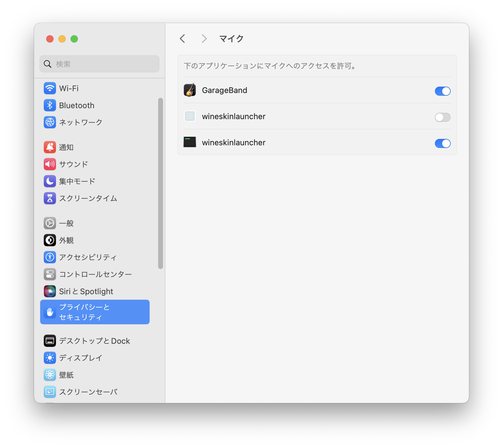 macOS 14.6.1の環境にて、下記スクショ画像のように削除済みのアプリ(真ん中のwineskinlauncher)に対するマイクへのアクセス設定がリストアップされ続けます