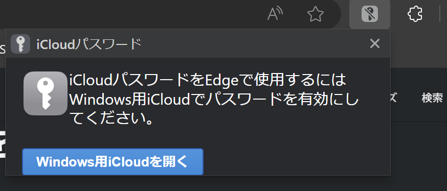 「iCloudパスワードをEdge(Chrome)で使用するにはWindows用iCloudでパスワードを有効にしてください」というポップアップのみ