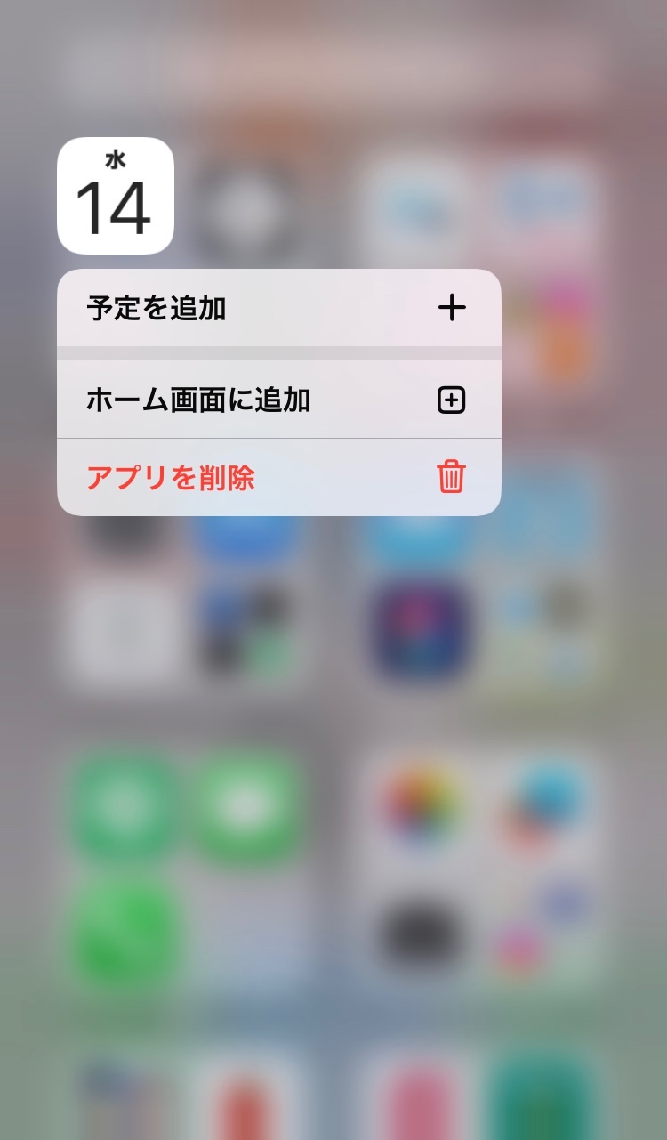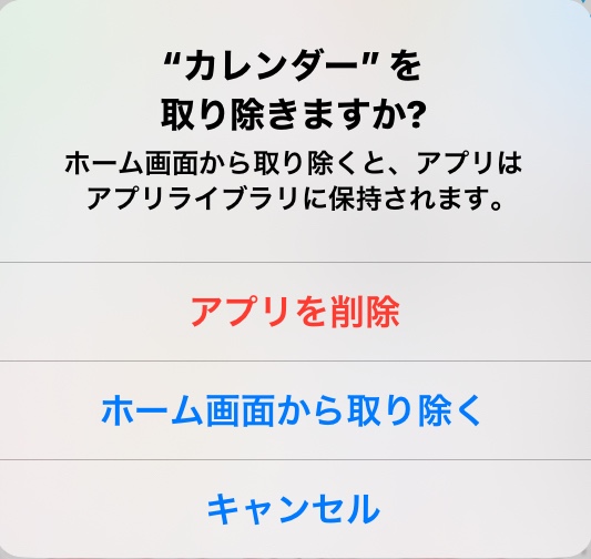 ホーム画面にあるカレンダーアプリのアイコンを長押しすると、「アプリを削除」「ホーム画面から取り除く」を選択できます。