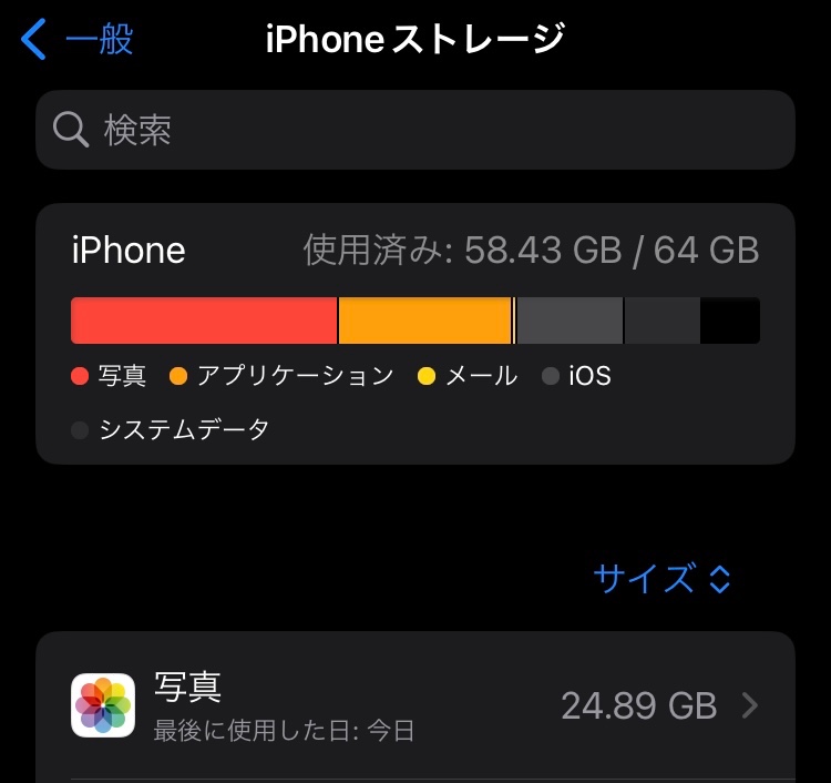 iPhonese第2世代の64gbを使っています。52枚の写真と1本のビデオだけ入っています。最近削除した項目は空にしています。3ヶ月ほど前から写真の容量が25gbくらいの状態が続いています。写真は1枚約2mb、1本のビデオは8.6mbで、計算しても25gbにはいきませんでした。あと共有アルバムを使用していて、合計300本ほどのビデオを共有アルバムに移してます。電源を切って1晩ほど放置したりしても効果はありませんでした…。何か対処法があれば教えていただきたいです。