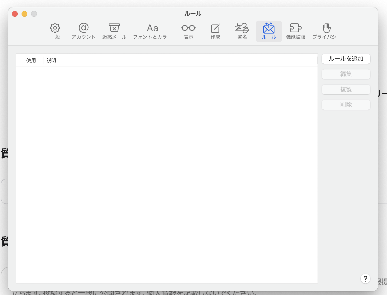 MacBookの純正メールアプリですが、全てのルールを削除したにも関わらず以前のルール(全てフォルダへの自動振り分け)が適用されてしまいます。メールのルールを完全に初期化するにはどうすれば良いでしょうか?