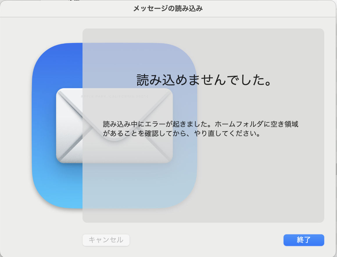 全てのメッセージを読み込んだ後に、しばらくして以下のエラーメッセージが表示されます。