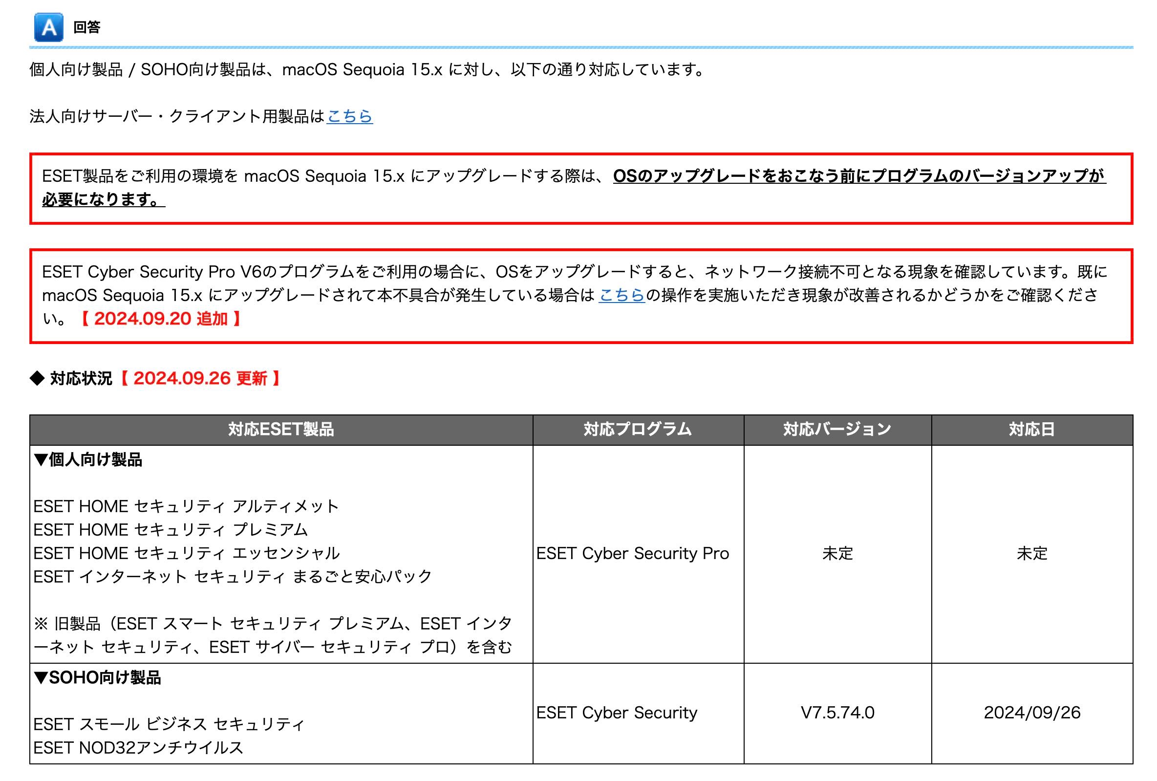 ESETは、macOS Sequoia 15.x へは、まだ対応していません。ご利用者さんは、Sequoia へアップグレードする「 前 」に、情報をご確認ください