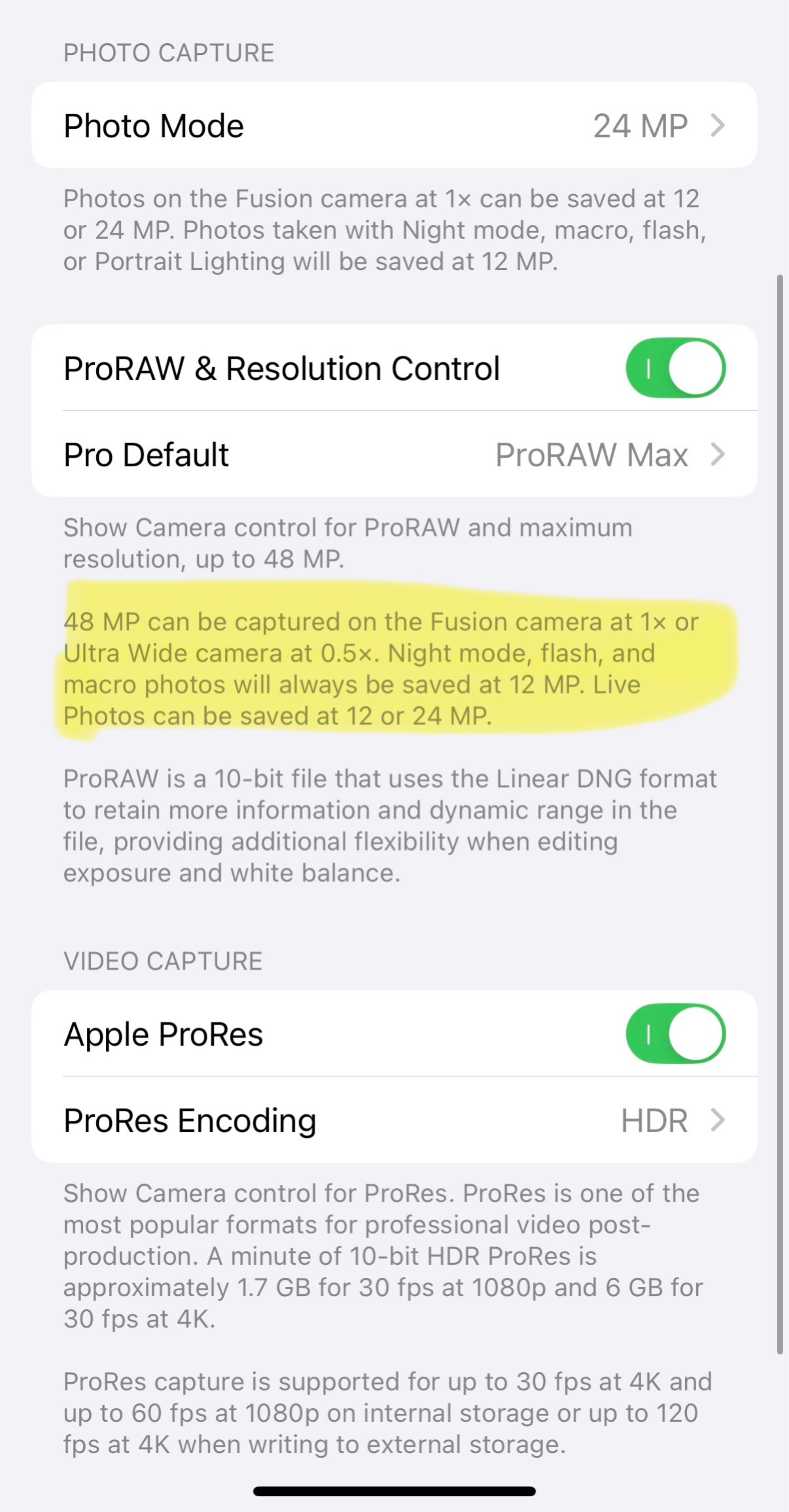 Pygoscelisさん自身が示してるスクリーンショットの同じ場所(ProRAWと解像度コントロール)の下の注記にマクロは常に12MPで保存されていると記述されていて,どこを見て48MPで保存されると誤解されたのか教えていただけると幸いです。