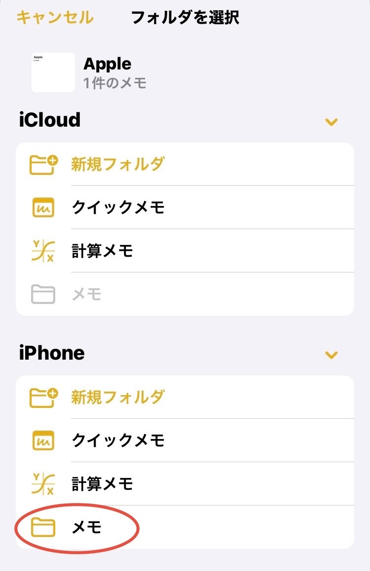 メモアプリ>フォルダー iCloud メモ>iPhoneに移動したいメモを選択し長押し>移動>iPhone メモ