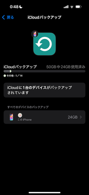 一枚目のスクリーンショットでは、iCloudバックアップのサイズが0KBと表示されているのに、2枚目のスクリーンショットでは、24GBとなっており、どちらが正しいのかわかりません。 お使いのiPhoneの機種やiOSのバージョンがわかりますか? 教えて下さい。