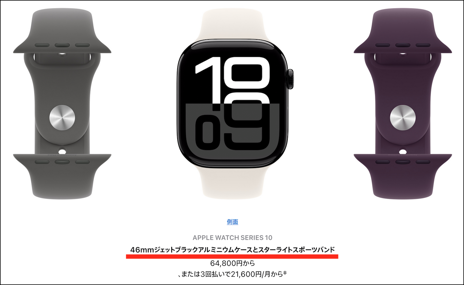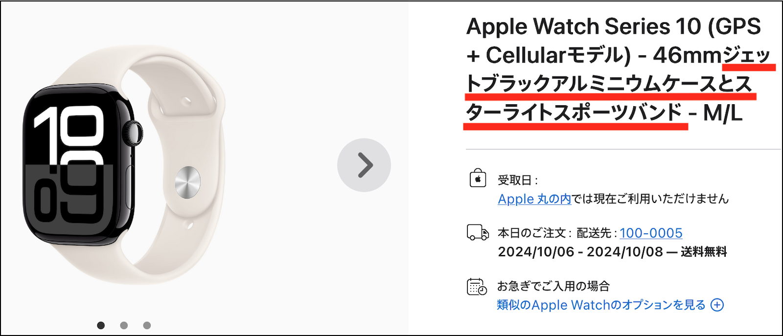 下の画像の様に、普通に Apple Watch Series 10 の購入ページで、ジェットブラックアルミニウムケースとスターライトスポーツバンドの組み合わせで購入可能 です。