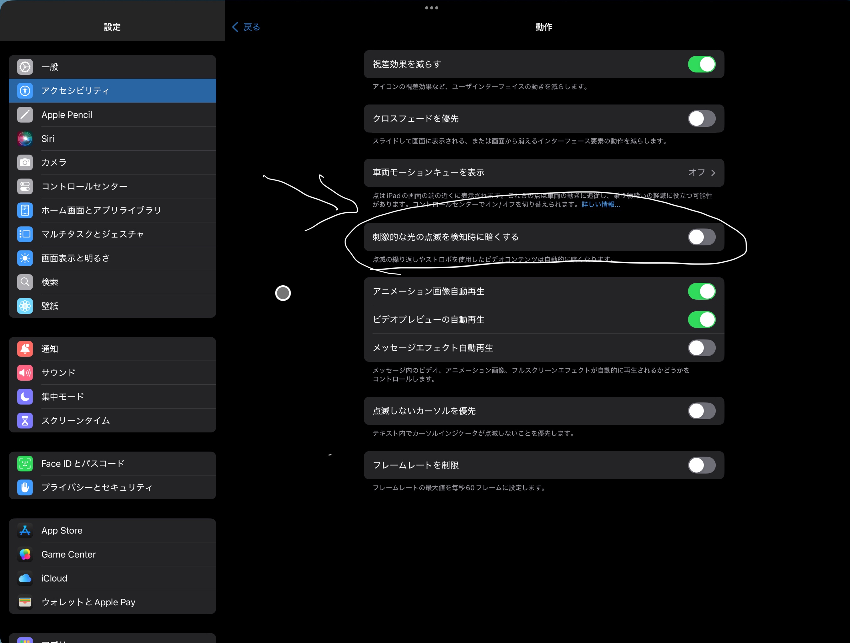 以下の「刺激的な光の点減を検知時に暗くする」がオンになっていませんでしょうか?