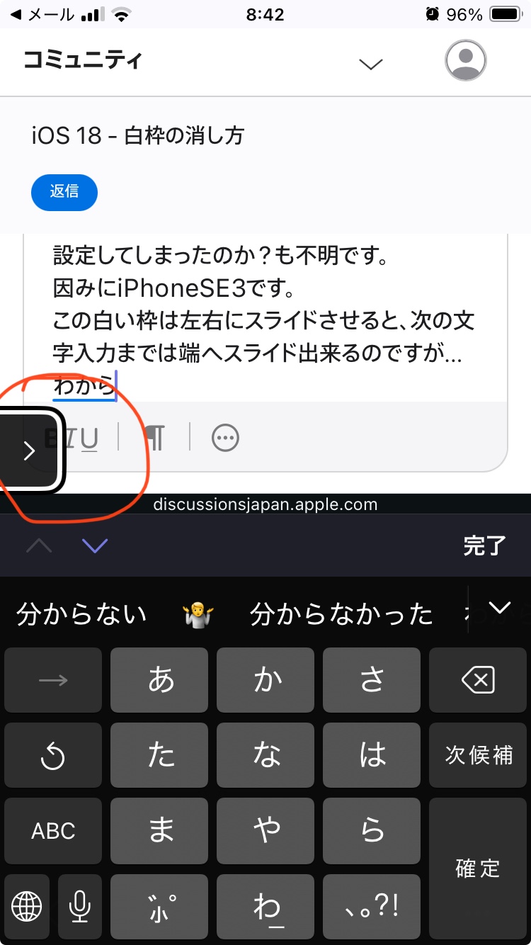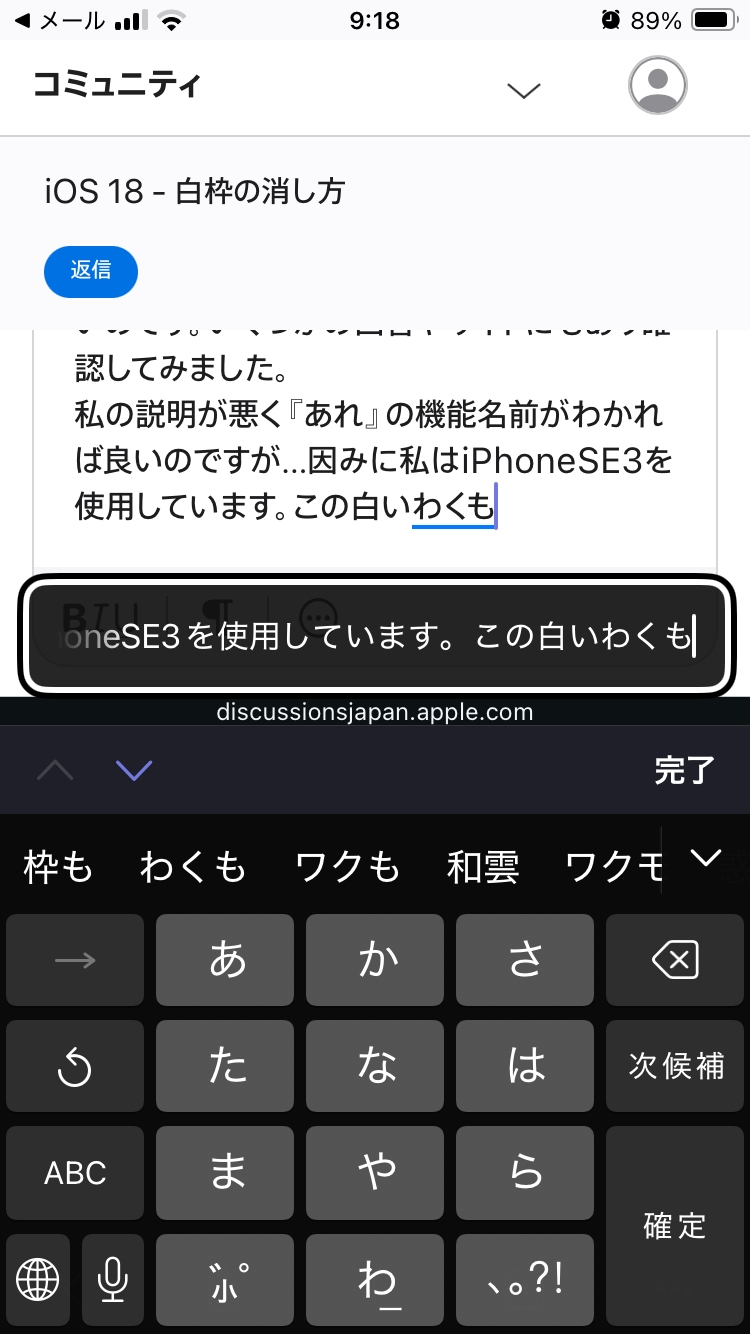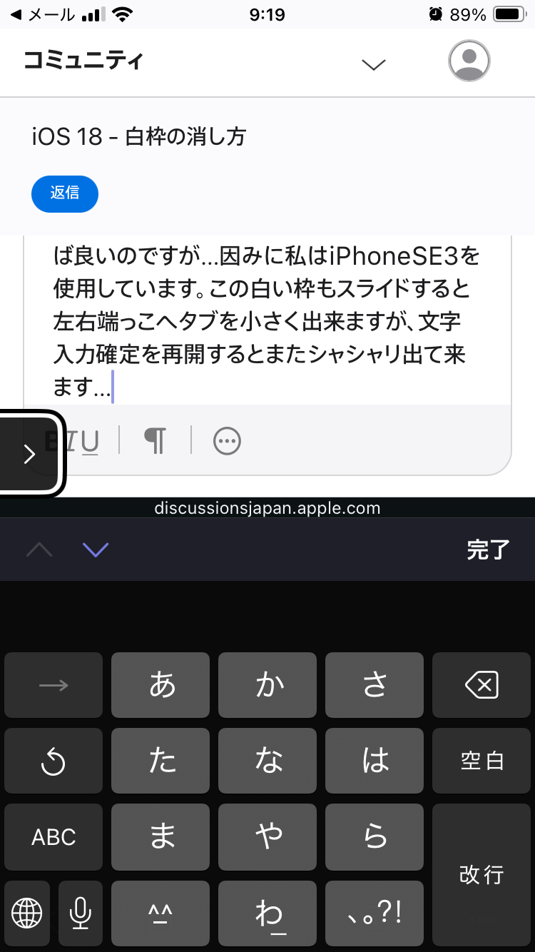 私の説明が悪く『あれ』の機能名前がわかれば良いのですが…因みに私はiPhoneSE3を使用しています。この白い枠もスライドすると左右端っこへタブを小さく出来ますが、文字入力確定を再開するとまたシャシャリ出て来ます…自分の機種なのにお恥ずかしい限りです。