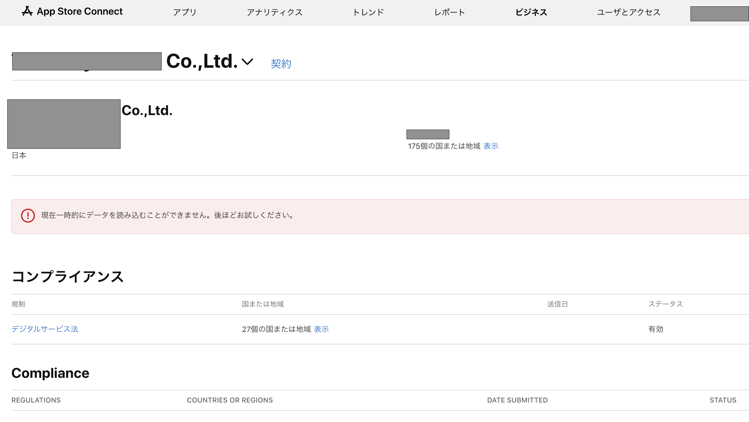 App Store Connentのビジネスタブ(Business)>法人ページ内で有料アプリ契約(口座の登録)がエラーになり、
