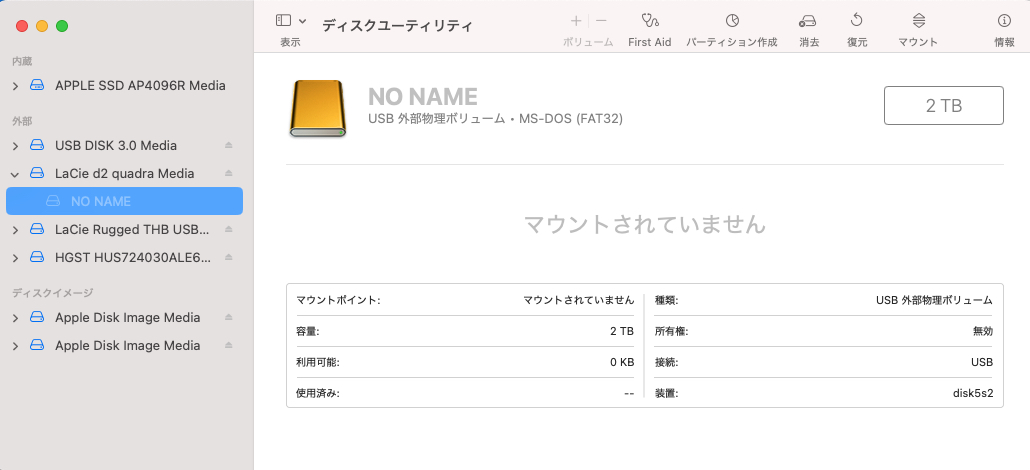ターミナルで強制マウントすると、ターミナル上では「マウントに成功した」というメッセージが出るのに、実際にはマウントされません。