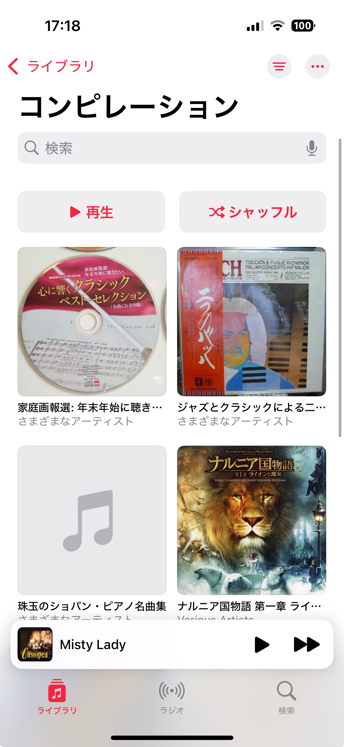 iphoneの「コンピレーション」セクションを見ると、バラバラの状態で表示されます。アルバムジャケットが曲の数だけ並ぶという状態です。