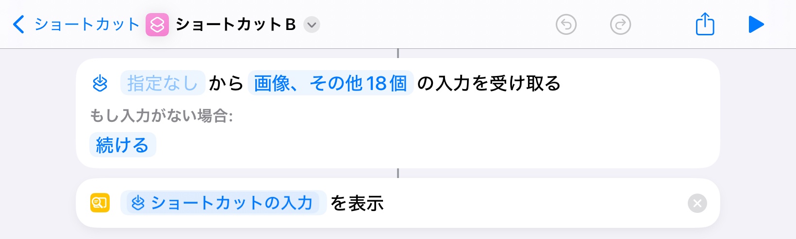 ショートカットBでは「ショートカットの入力を受け取る」ようにしています。