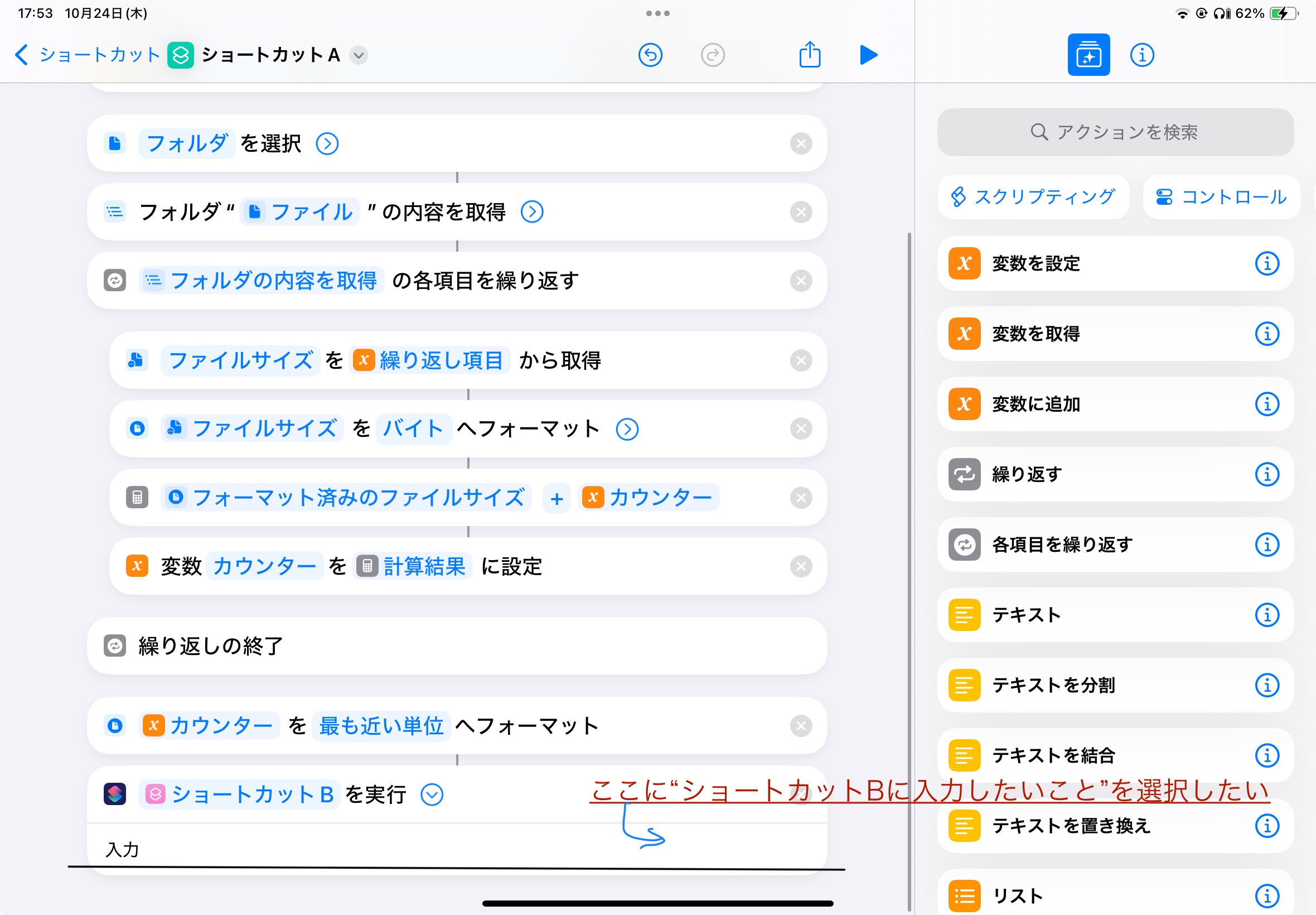 つまり、Aの作成画面を開いて「スクリプティング」の「ショートカットを実行」を追加してショートカットBを選択し、Bに「入力」したいことを選択したい。しかしできない。