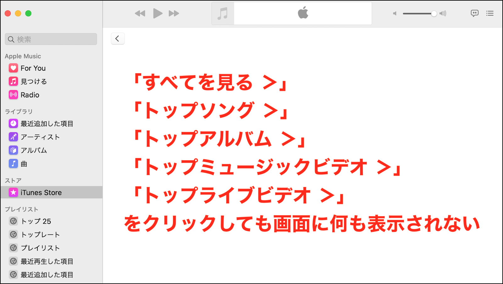 私の環境は Windows 版の「iTunes」ではなく、macOS Catalina(10.15.7)の「ミュージック.app(1.0.6.10)」ですが、iTunes Store の「すべてを見る >」、「トップソング >」、「トップアルバム >」、「トップミュージックビデオ >」、「トップライブビデオ >」の何れかをクリックすると、下の画像の様に画面に何も表示されません。