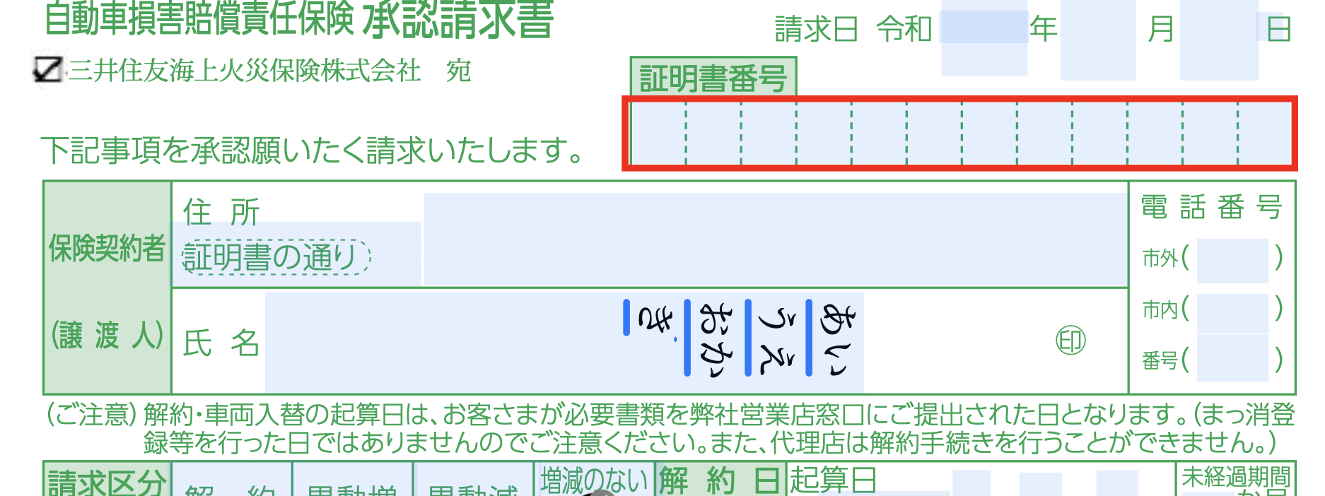 今回遭遇したPDFは一般公開されているものでして,「三井住友海上」「自賠責」「名義変更」で検索して出てくるページの,緑色の四角1〜5番の項目の5番の下,「(1) 自動車損害賠償責任保険承認請求書」を開いたところにある,「入力機能付承認請求書(383.7KB)」というPDFです。
