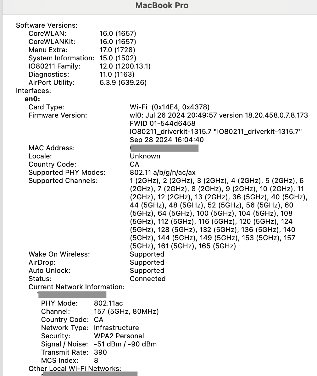 wifiの仕様によれば、日本から持ち込んだmacでもcanadaで使う時には、country codeはCAになりますね。なので、chanel 157でも問題ないはずということになります。157がsupported chanelのリストに入ってます。日本国内で、これを表示させると、chanel 157はsapported list(対応チャネル)にはいってないです。