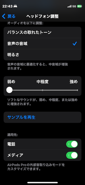 また、コントロールセンター(画面の右上を下にスワイプすると出てくるメニュー)の音量を長押しして、「ノイズコントロール」をタップして変更することも可能です。