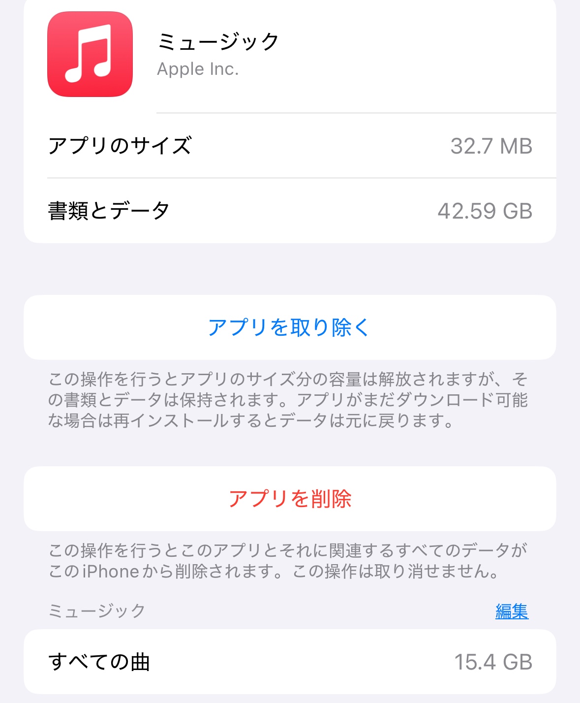 iPhoneのストレージを確認したら いきなり一気に増えておりまして 詳細を確認したらApple Musicの書類とデータが気が付いたら42G近くまで膨れ上がってました・・・ Apple Musicには年間契約しており 基本ダウンロードはせず、ストリーミング再生のみです。 なぜこのようなことが起きるのでしょうか? ずっと使ってましたが、確か数Gしかなかったのに、ここ最近でいきなり急に増えてます。 1日でどんどん増えていってるのですが、何か解消方法はあるんでしょうか? 色々調べても一旦アプリを消すとかしか出てこないんですが、何曲かパソコンからダウンロードした曲があって、現在はパソコンを使用しておらずアプリを消すとiTunesで繋いだ音楽は消えると読んで、アプリの削除は踏み切れません。 iPhoneのストレージをせっかく色々消していって広げたはずなのにいきなり圧迫されて困ってます・・・ アプリの不具合なのでしょうか? 解決方法はあるんでしょうか?