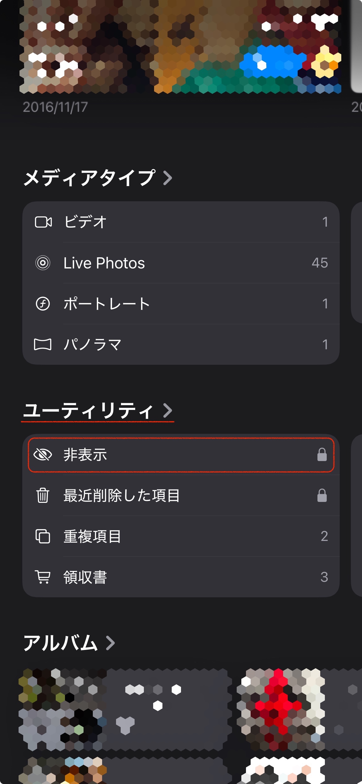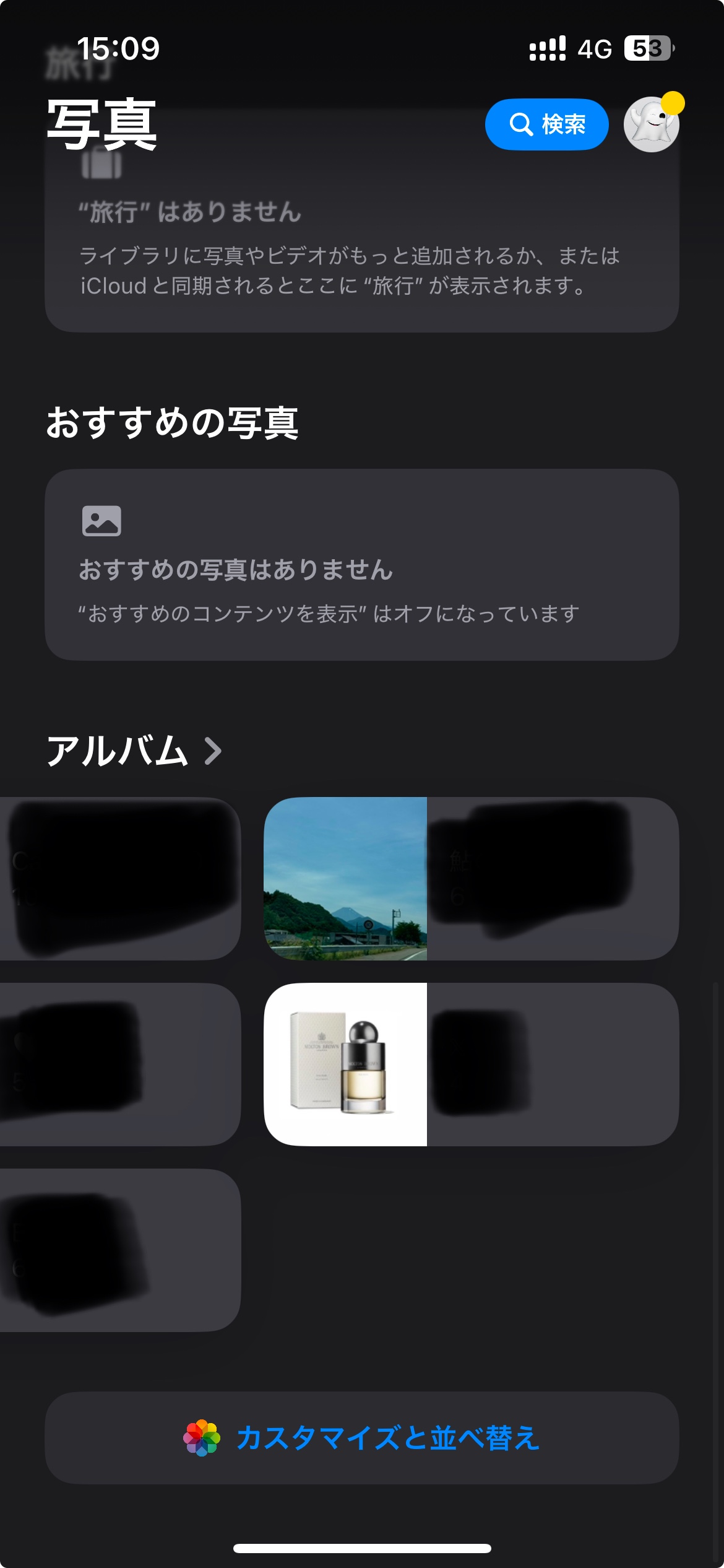 右上の自分のアイコンを押すと、非表示アルバムのトグルがありますが、どっちにしても変わりません。また今までのデータが消えた可能性も考え、新しく非表示に入れてみたんですが変わらず見れません…。