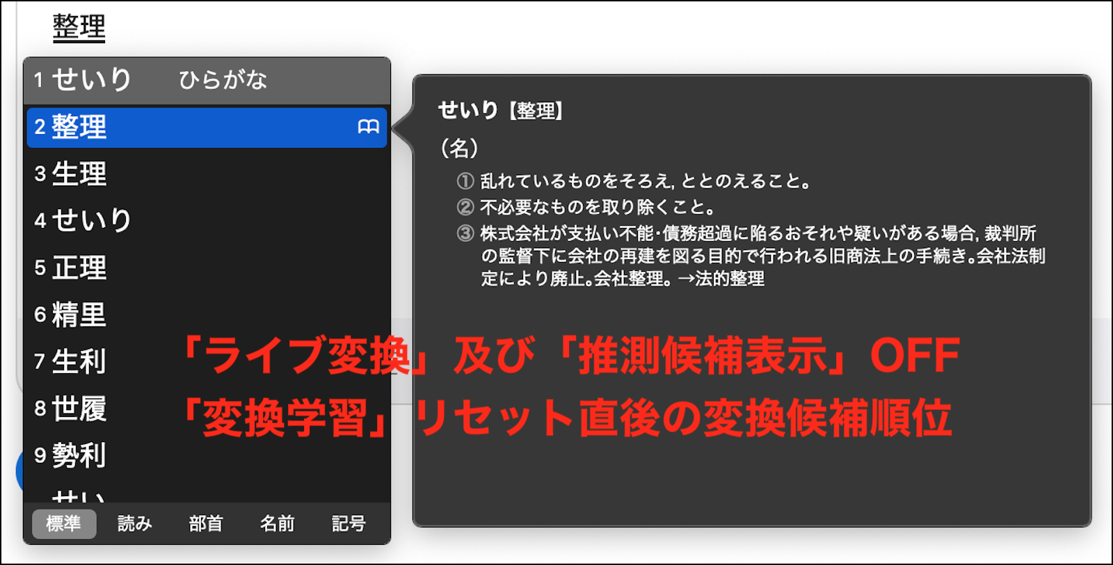 変換の優先順位は、使用頻度や直前に変換した候補等によって頻繁に変更されます が、「ライブ変換」及び「推測候補表示」を OFF にして、「変換学習」をリセットした直後であれば、下の画像の様な優先順位 (「整理」が「生理」よりも上)になっているかと思います。
