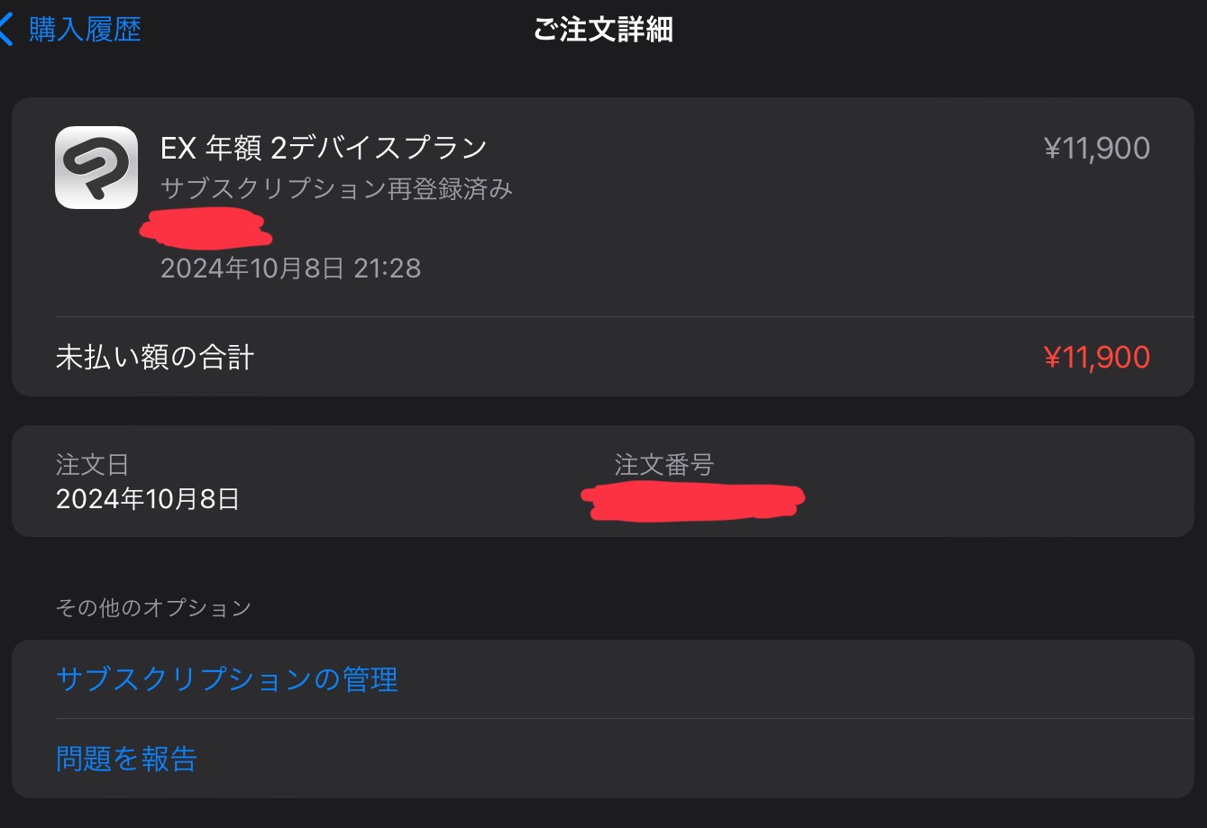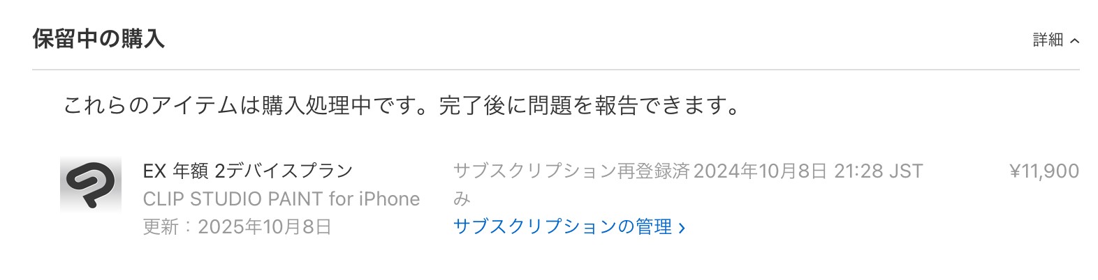 購入履歴を見ると、前回のサブスクが未払い(購入処理中)になっていた。