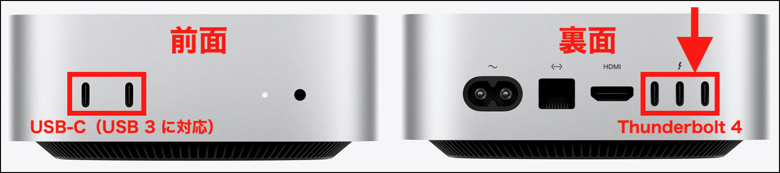 (前面のポート(下の画像左側の赤枠部分)の形状は USB-C ですが、Thunderbolt 4(USB-C)ポートではありません)