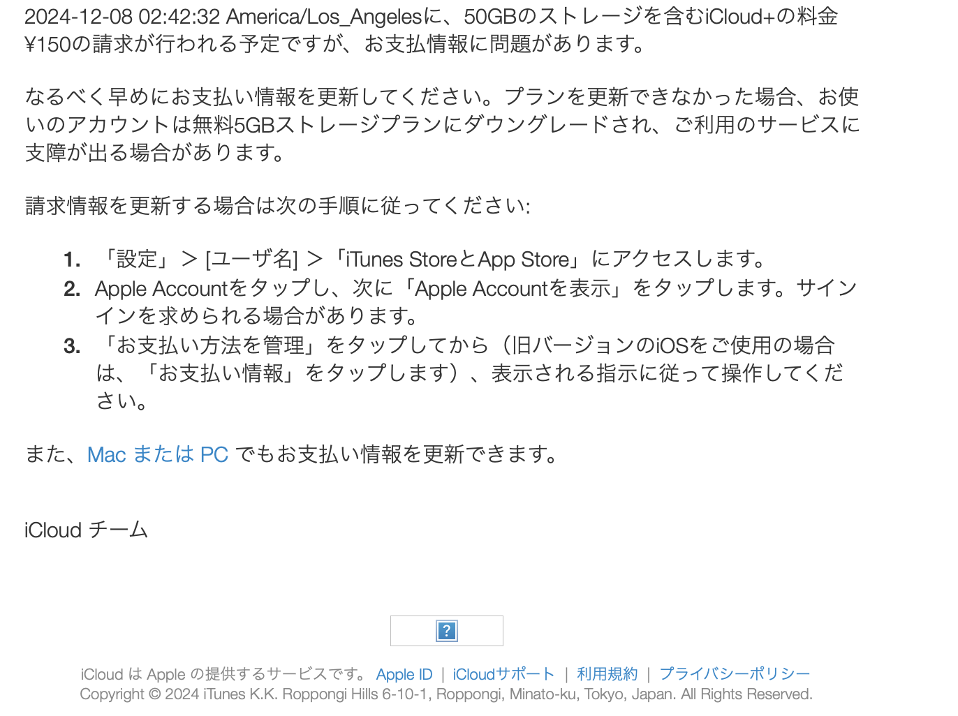 tomo7144 さんがお使いの環境が分かりませんが、tomo7144 さんがお使いの環境が、iOS 16、iPadOS 16、macOS Ventura(13.x)以降の場合は、デジタル署名で本物の Apple からのメールかどうかを確認 して見て下さい。