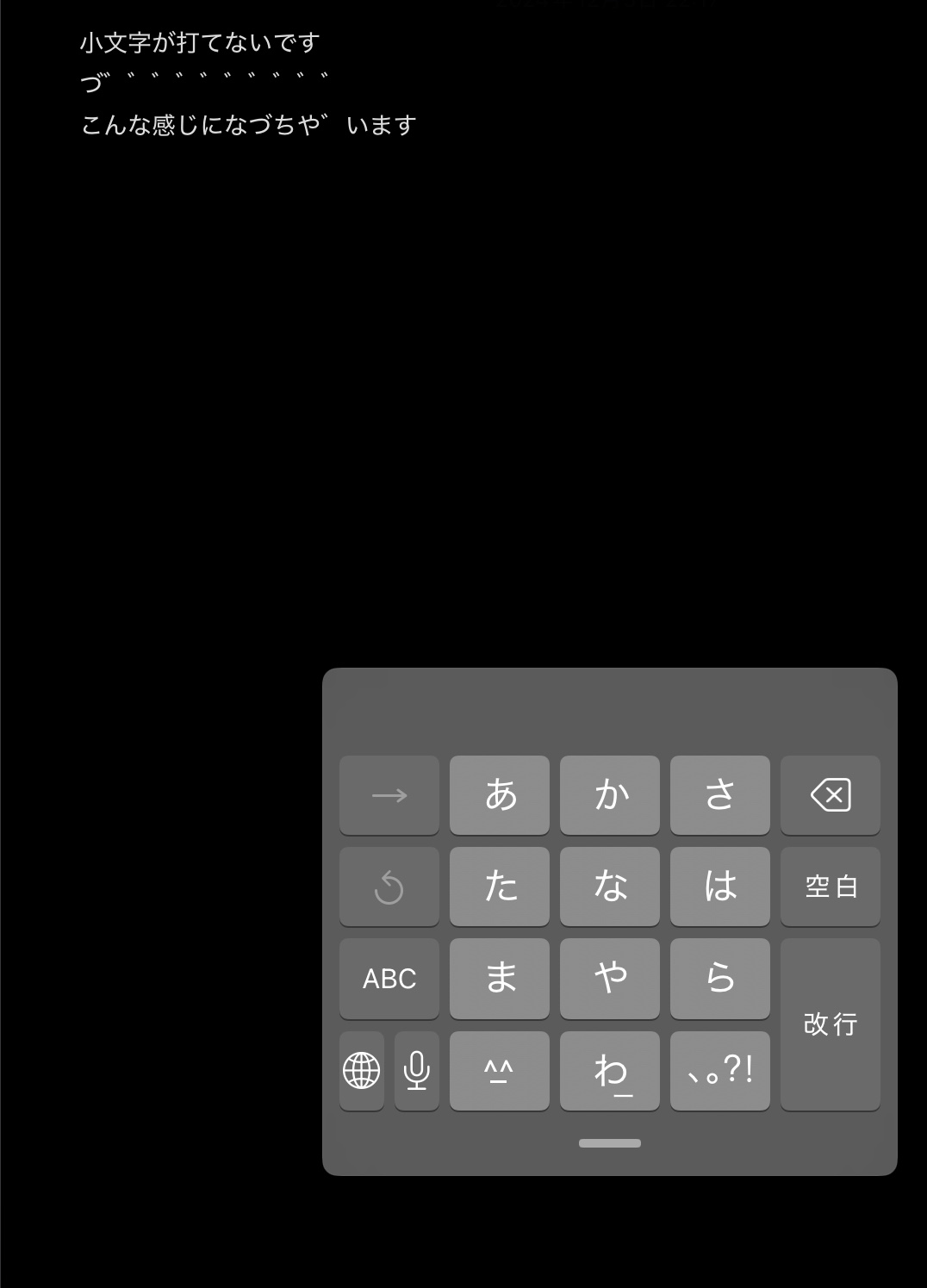 iPad OS を最新のものにアップデートしてから、ハードウェアキーボード使用時に小文字が打てずに濁点などが出てくるようになりました。学校で購入して使っているのでキーボードが着いた状態でオンスクリーンキーボードを使いたいので対処法ご存知の方がいたら教えて欲しいです。