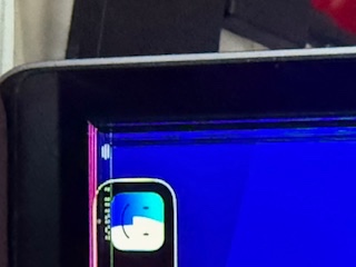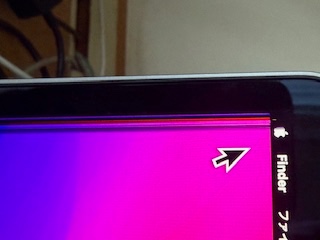 返答ありがとうございます。背景を替えてもデザイン、色使いで目立つ目立たないは変わりますがやはり出ますね。スクリーンショットで撮影してみたのですが、それには映ってきませんでした。でも左端などはアップルマークが縦に分割されているのがわかります。スマホで写真撮ってみました。