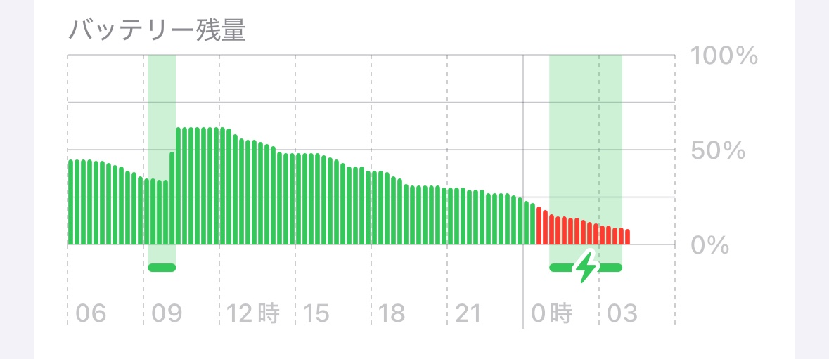 設定のバッテリーのグラフを確認してみると確かに充電してる状態になっているのにも関わらずバッテリーが減って行っています。原因がわかりません。