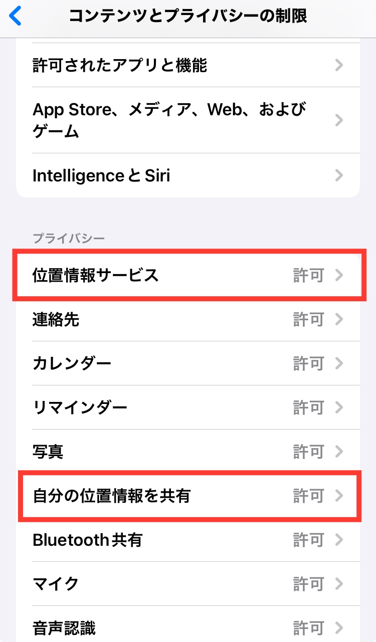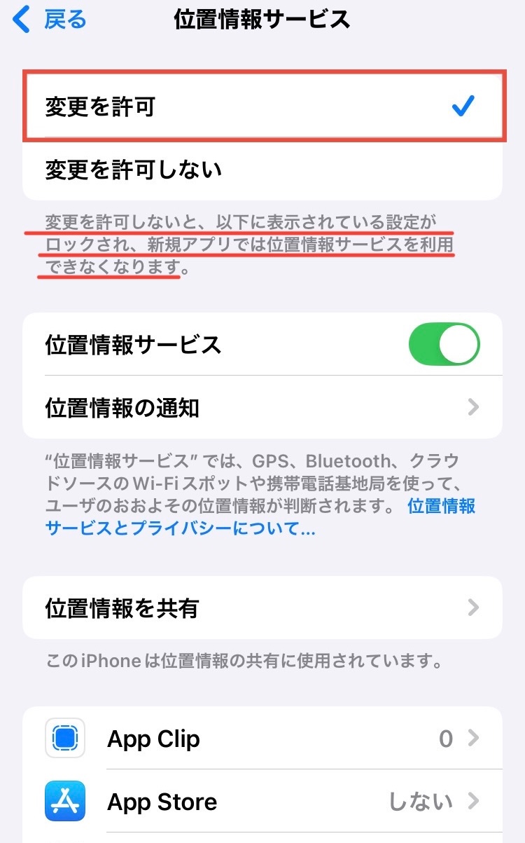 設定>スクリーンタイム>コンテンツとプライバシーの制限>位置情報サービス あたりを確認してみてはいかがですか?
