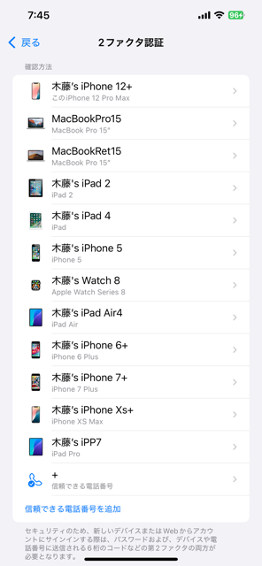2ファクタ認証 >をタップすると確認方法がiPhone14とiPadと自分の電話番号になっています。