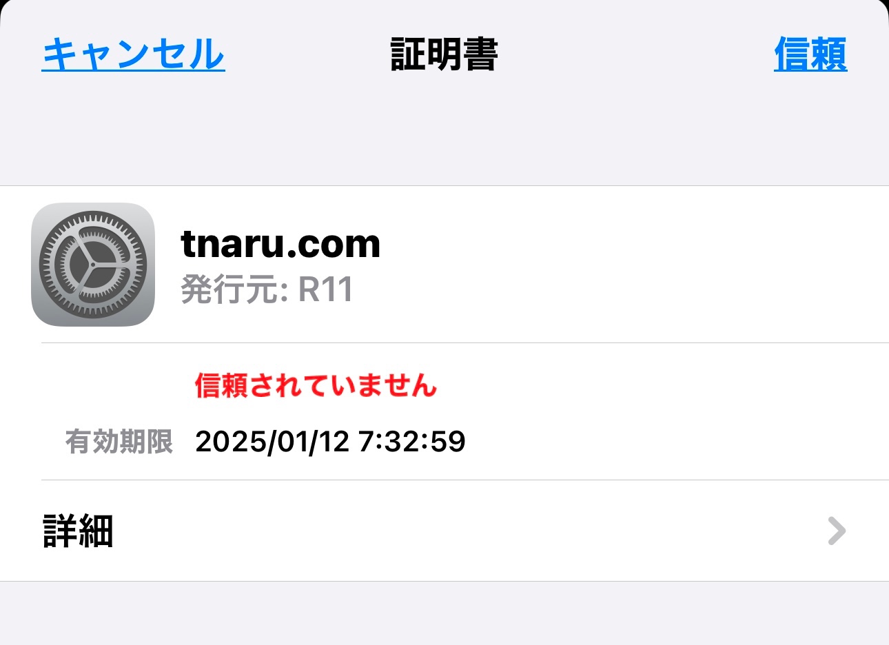 「サーバの識別情報を検証できません」がいつも出てきてしまって困る。iphonn16プラス メールは設定なし。時刻も合っている。再起動も何回もした。