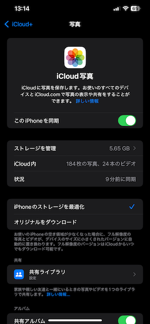 iCloudストレージが5.65GBになっていますが、50GBを契約されているのでしょうか。それなら、時間がたてば本体にもダウンロードしてくると思いますが、もしアップグレードしていない5GBのままなら、写真を追加も何もできないと思います。