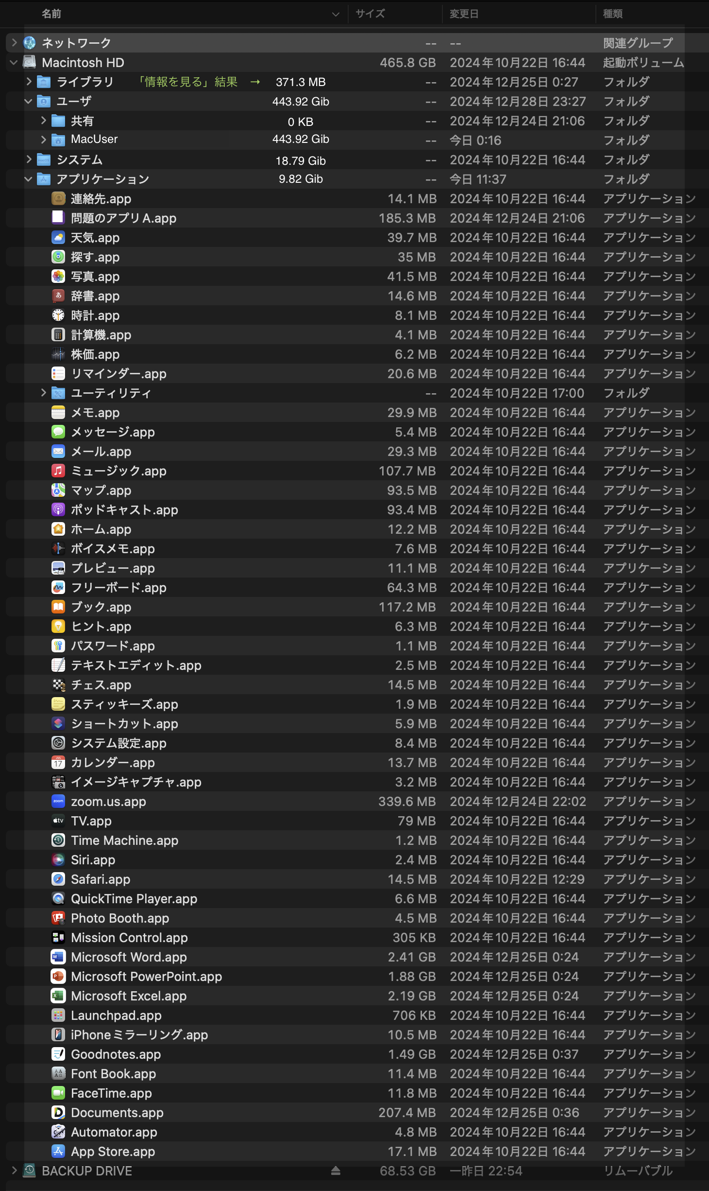 「ユーザ」配下の「MacUser」 443.92Gib とあったので